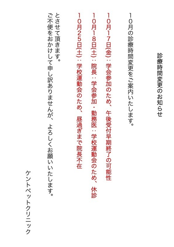 2025.10.06 お知らせ 10月の診療時間変更のお知らせ ご訪問ありがとうございます。遅くなってしまい申し訳ありませんが10月の診療時間変更を更新しましたので添付画像もしくはトップページカレンダーでのご確認をお願いいたします。今月は学会と運動会シーズンが重なり変更が多くなっております。ご迷惑をおかけして申し訳ありませんがよろしくお願いいたします。 pdfはこちら